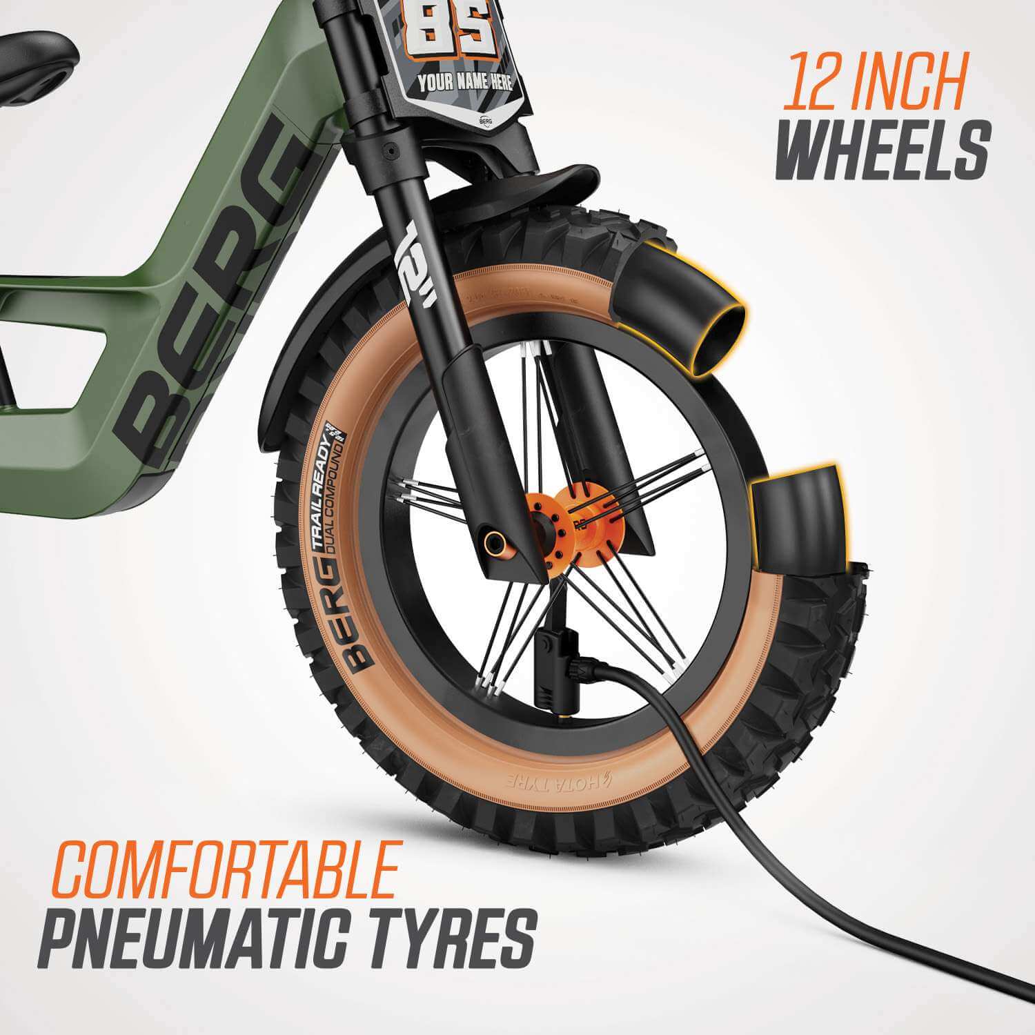 Whether its mud, gravel, or winding trails, the BERG Biky Trail Green Handbrake is built to conquer them all. With its off-road look, protective mudguards, and number plate with stickers, this ride-on is every mini-racer’s dream. Wherever they roll, this rugged balance bike turns everyday rides into epic adventures.