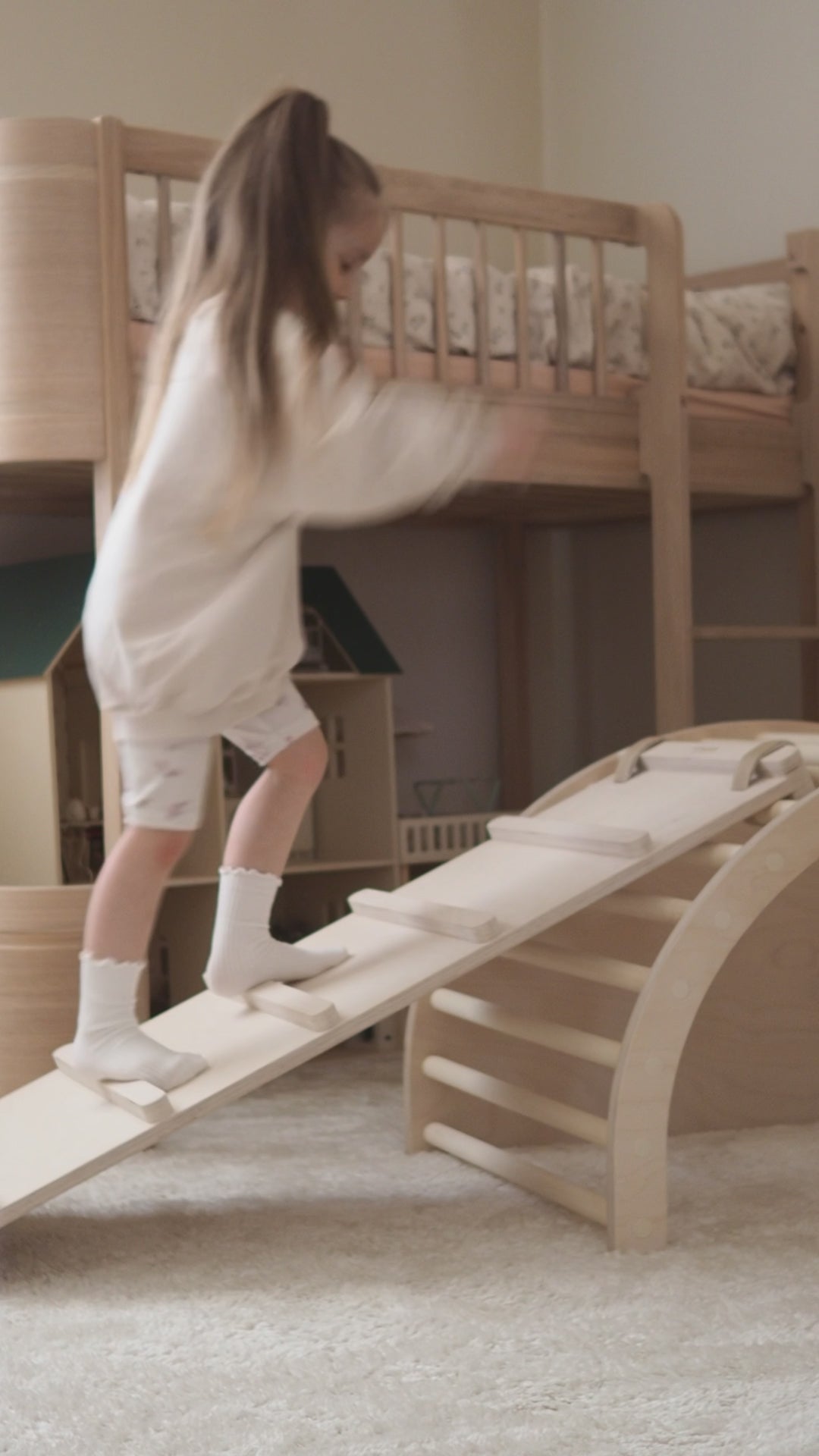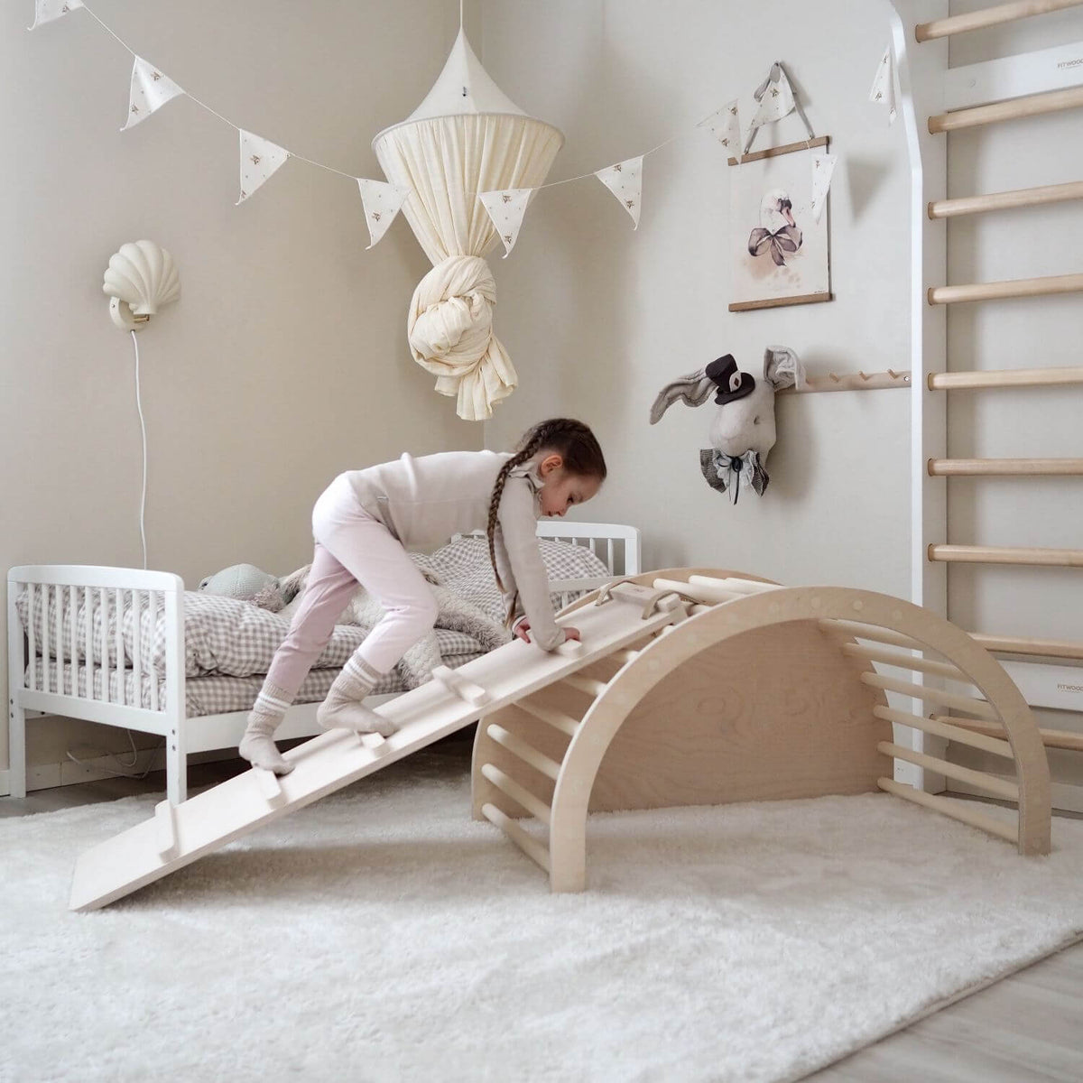 The slide ramp has two sides, one for sliding and the other for climbing. It's easy to set up, as it doesn't require fixed installation, and its angle can be adjusted by simply placing it on a different bar.